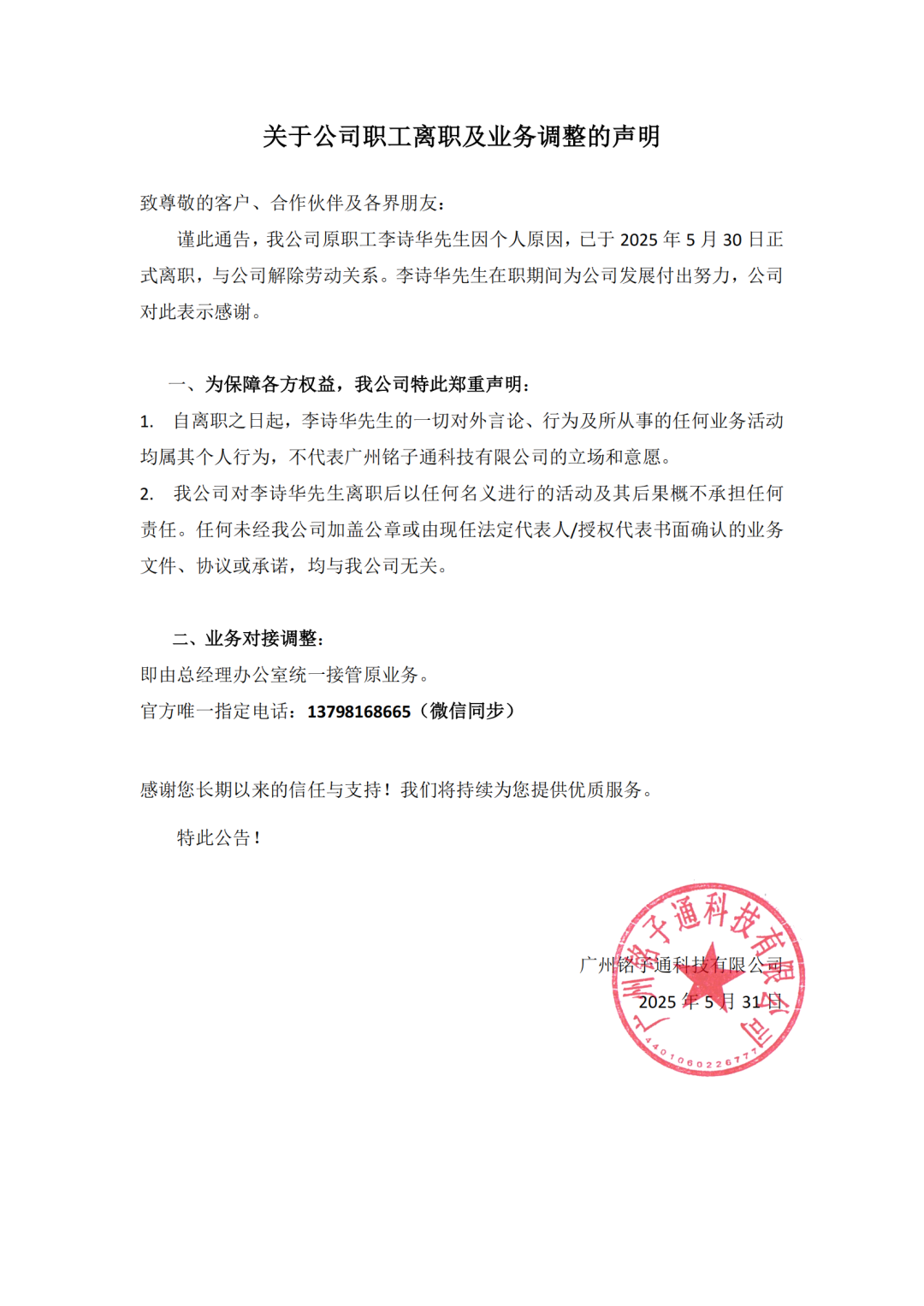 关于公司职工离职及业务调整的声明